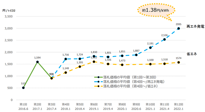 日本のJクレジット制度は2013年にスタートし、当初価格は再エネ由来で500円/t-CO2スタートし、現在は3,000円/t-CO2まで上昇する動きとなっています。